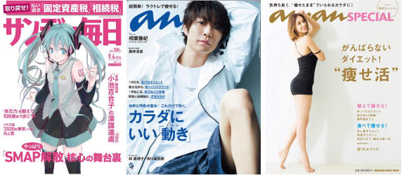 - 雑誌『サンデー毎日』『女性セブン』『anan』掲載